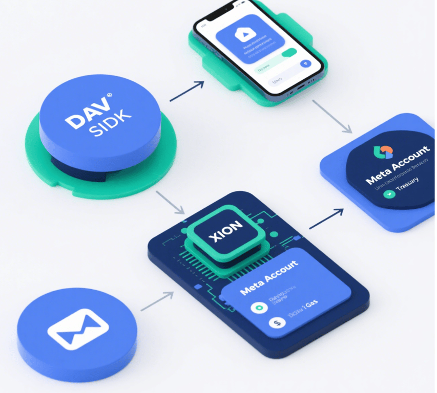 Dave 工作原理示意:移动应用集成 Dave SDK 后,利用 XION 底层的链抽象能力与区块链交互。用户通过熟悉的邮箱/社交账户登录绑定链上 Meta Account(元账户),应用端的 Treasury 合约为用户代付交易 Gas 费,从而实现全过程无钱包、无感知的链上操作。